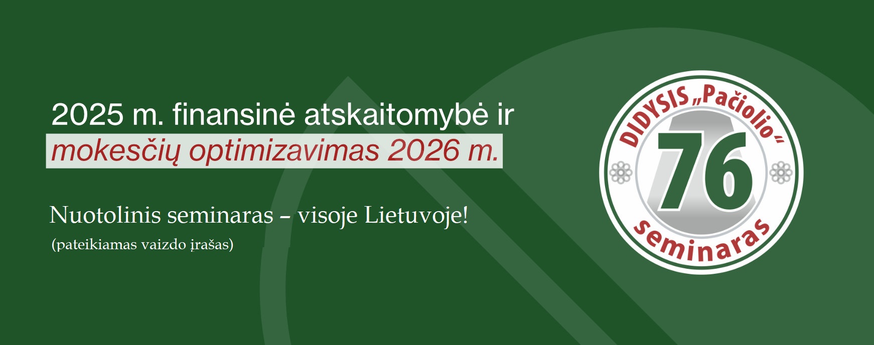 Vertingos ekspertų įžvalgos ir svarbūs patarimai – visoms įmonėms aktualiame „Pačiolio“ didžiajame seminare „2025 m. finansinė atskaitomybė ir mokesčių optimizavimas 2026 m. Veiksmai, kuriuos įmonei reikia atlikti dabar“.Kaina iki balandžio 25 d. – 129 € (vietoje 159 €). PVM netaikomas